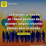 Saviez-vous que ? Le français se trouve en 10ème position des grandes langues vivantes parlées dans le monde. Maxime Marquette 2013-08-02 15:20:06 Partagez : Le français se trouve en 10ème position des grandes langues vivantes parlées dans le monde. Copié! Commentaires 0 0 votes Évaluation de l'article Subscribe Login Notify of new follow-up comments new replies to my comments Label {} [+] Nom* E-mail* Site web Label {} [+] Nom* E-mail* Site web 3 Commentaires Newest Oldest Most Voted Inline Feedbacks View all comments Abercrombie&Fitch 12 years ago BOUFFON ON EST 4ème ! tg97 11 years ago Reply to Abercrombie&Fitch Ça dépend si on parle du nombre de pays ou de personnes qui parlent français dans le monde Poppa 12 years ago Et quels sont les 9 autres ?