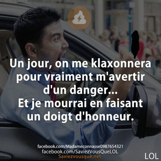 Un jour, on me klaxonnera pour vraiment m'avertir d'un danger... Et je mourrai en faisant un doigt d'honneur.