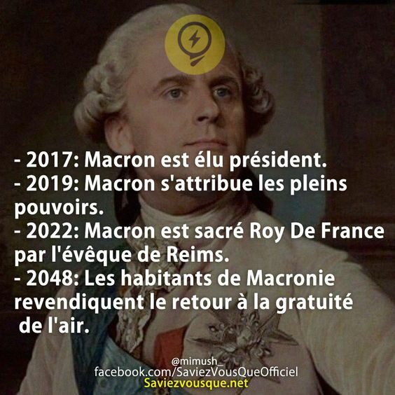 - 2017: Macron est élu président. - 2019: Macron s'attribue les pleins pouvoirs. - 2022: Macron est sacré Roy De France par l'évêque de Reims. - 2048: Les habitants de Macronie revendiquent le retour à la gratuité de l'air.
