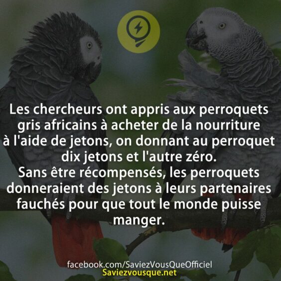 Les chercheurs ont appris aux perroquets gris africains à acheter de la nourriture à l'aide de jetons, on donnant au perroquet dix jetons et l'autre zéro. Sans être récompensés, les perroquets donneraient des jetons à leurs partenaires fauchés pour que tout le monde puisse manger.